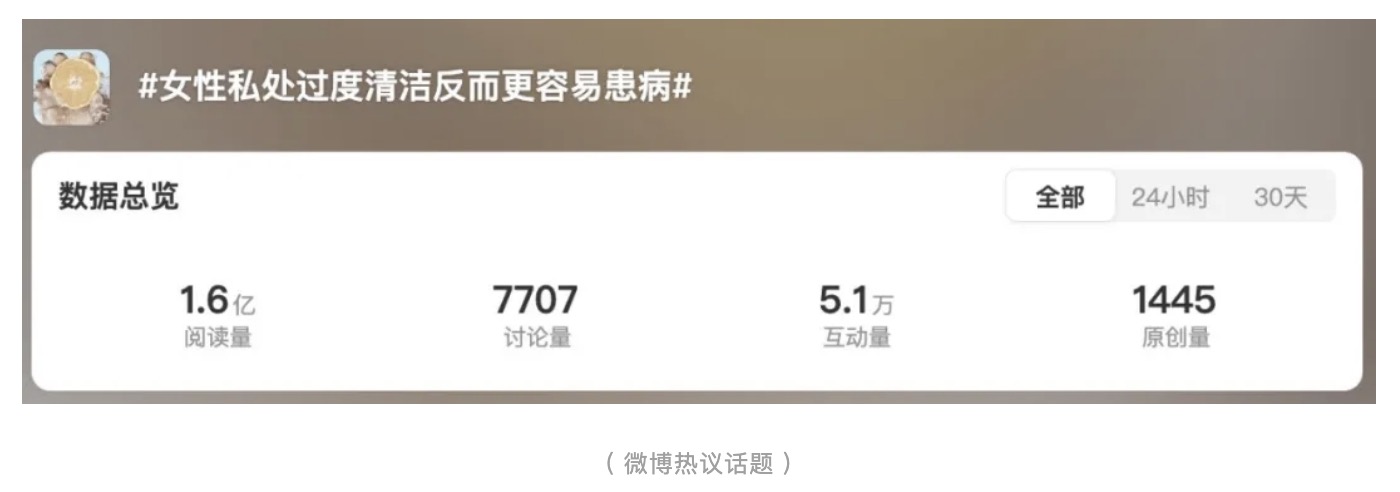 最近,微博上的一條熱搜引起了大家的關(guān)注——“女性私處過(guò)度清潔反而更容易患?。?/strong>”。截止截稿,該話題已被1.6億人瀏覽、討論。